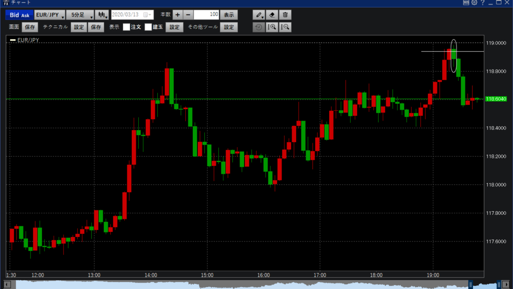 結果的には次の5分足で一回押し返されたが現在は50pipsも上の水準。