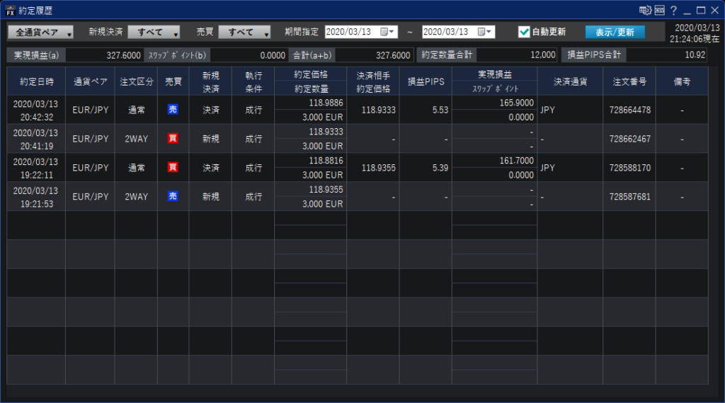 ユーロ円を売り1回、買い1回の取引。