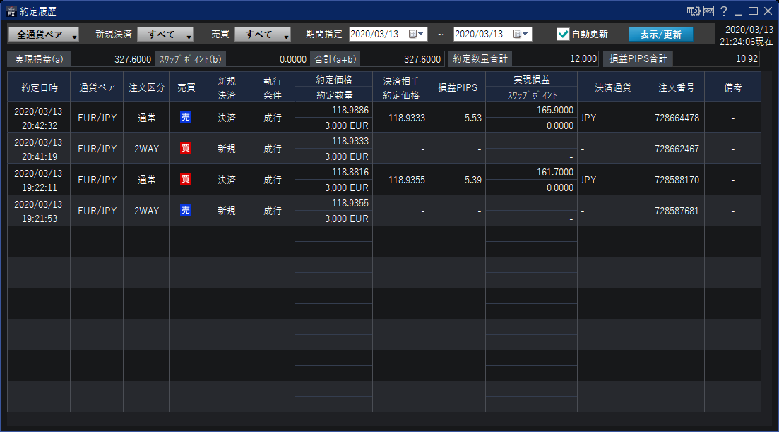 ユーロ円を売り1回、買い1回の取引。