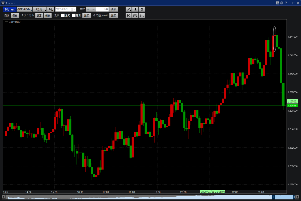 23:30 ポンドドル取引。上に行く強い場面でついていこうとした。インした瞬間に勢いがなくなって、反動で強い勢いで逆に行きやすいパターンの下げをもろに食らった。