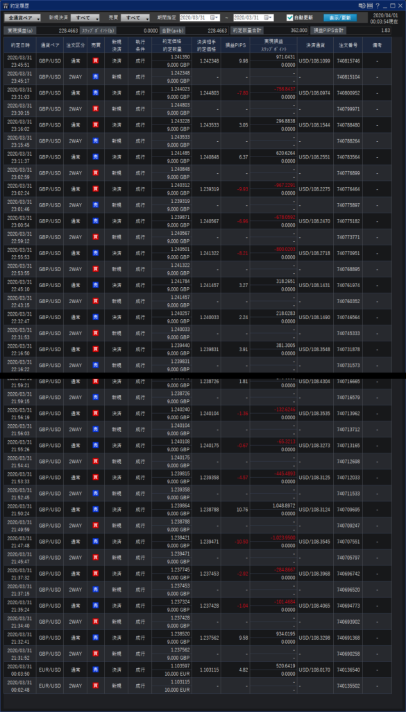 +228円 上への勢い強い時、順張りで付いていって、失敗してモロ逆食らうパターン
