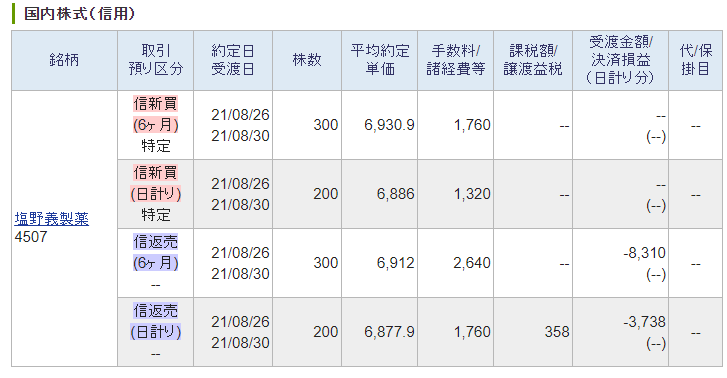 朝一塩野義で買いで入って思いっきりマイナスを食らう。一瞬で2000円位のマイナスを見せられ、負け額を更新するのが嫌で損切りをためらった、その少しの間にまた大きく下がっていき一瞬で10,000円以上のマイナスになってしまった。